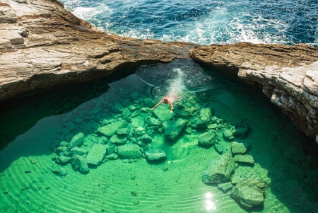 На побережье греческого острова Тассос плещутся воды маленькой, но очень красивой лагуны. Этот естественный бассейн называется Гиола, он отделен от моря узкой каменной перемычкой.