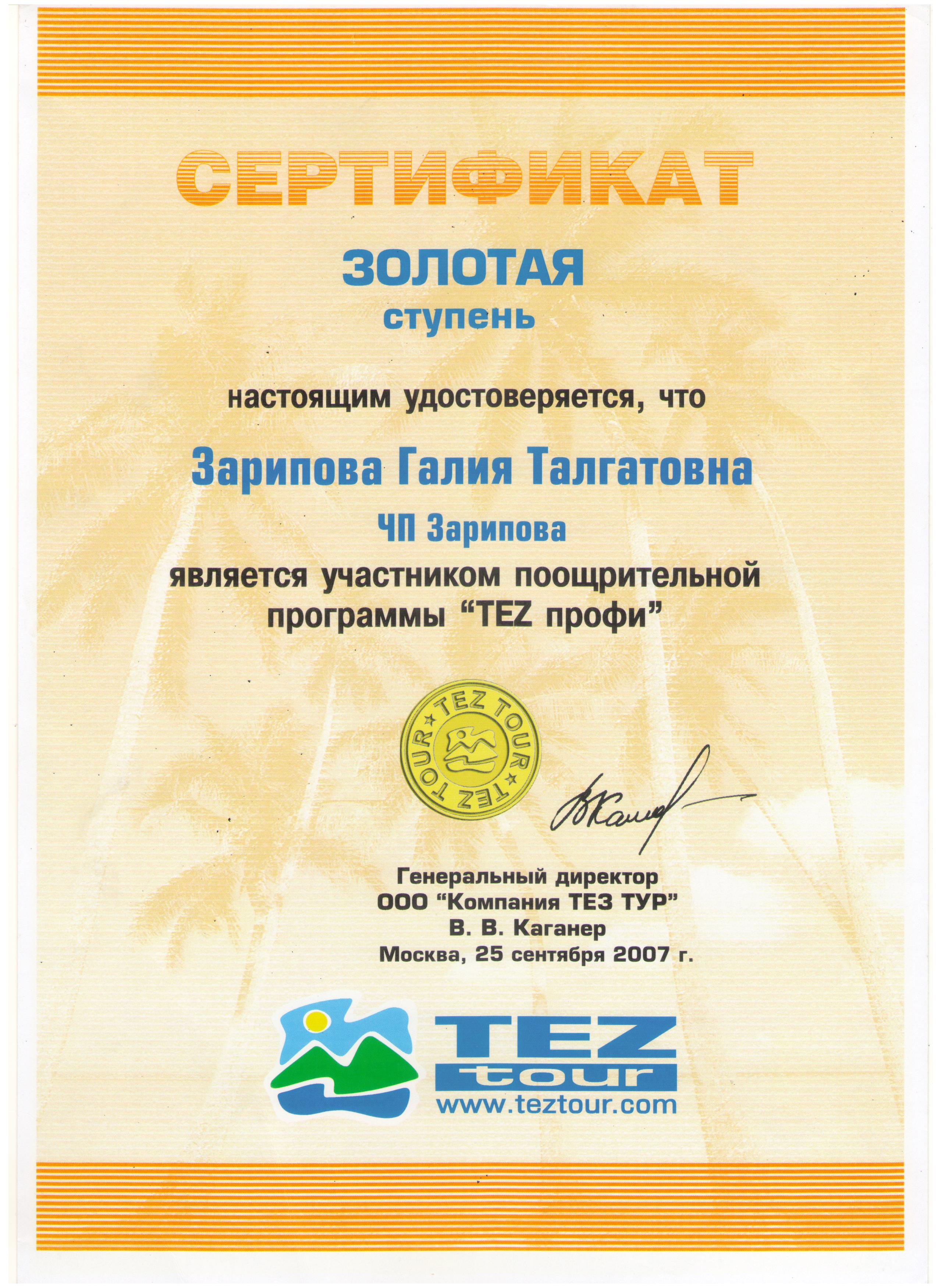TEZ TOUR - Сертификат Зариповой Галие Талгатовне - является участником поощрительной программы "TEZ профи" (2007 год).