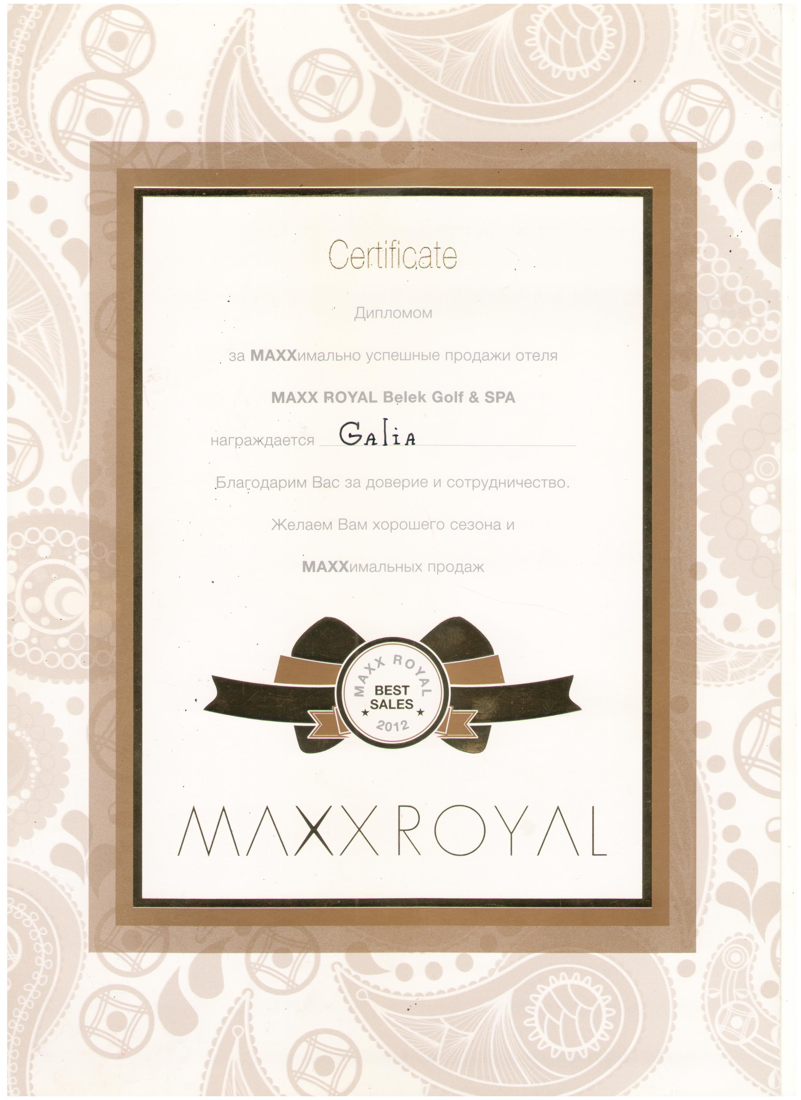 Maxx Royal - Диплом за максимально успешные продажи отеля Maxx Royal Belek Golf & Spa (2012 год).
