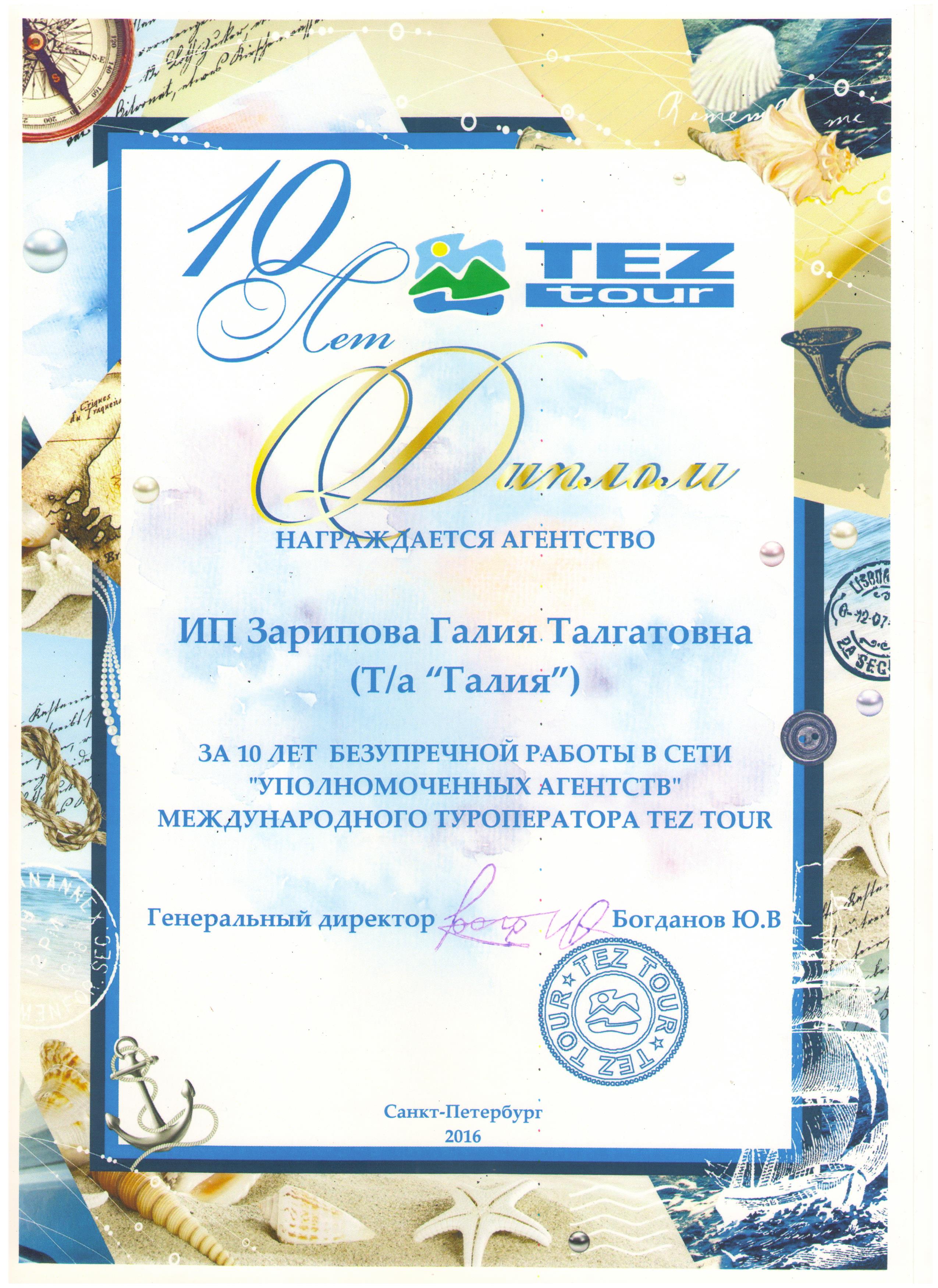 TEZ TOUR - Диплом за 10 лет безупречной работы в сети "Уполномоченных агентств" международного туроператора TEZ TOUR (2016 год).