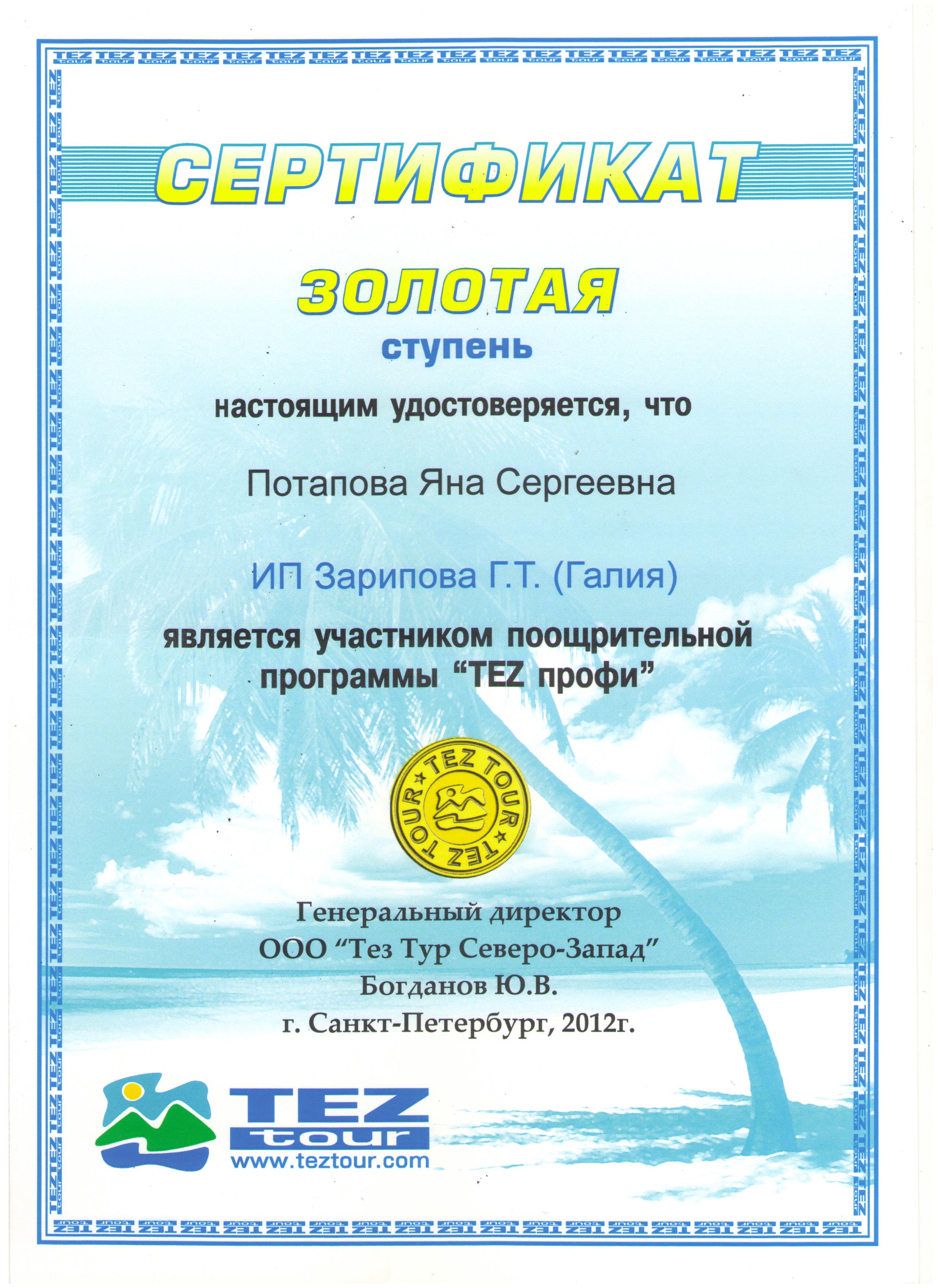 TEZ TOUR - Сертификат Зариповой Галие Талгатовне - является участником поощрительной программы "TEZ профи" (2012 год).