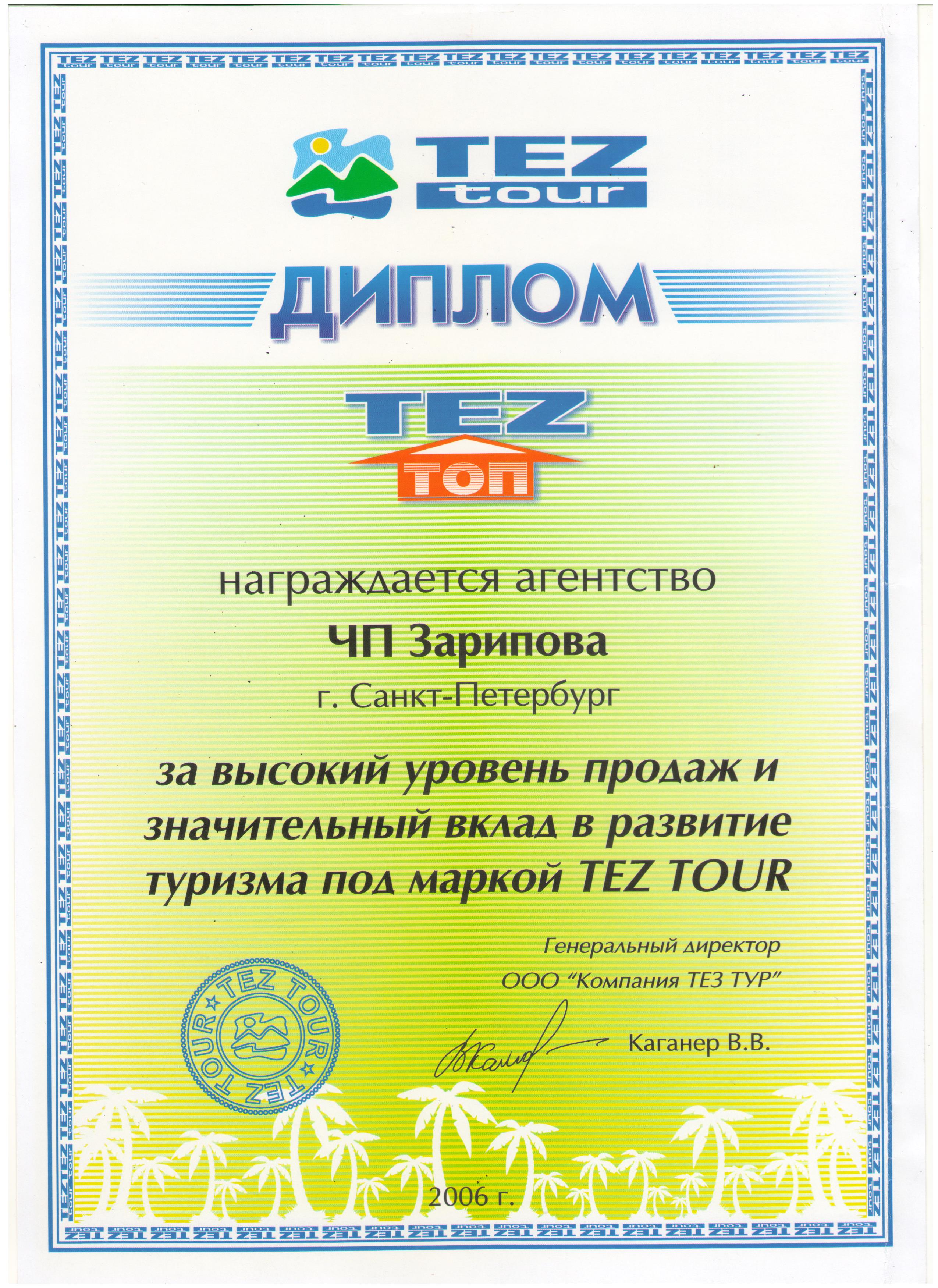 TEZ TOUR - Диплом за высокий уровень продаж и значительный вклад в развитие туризма под маркой TEZ TOUR (2006 год).