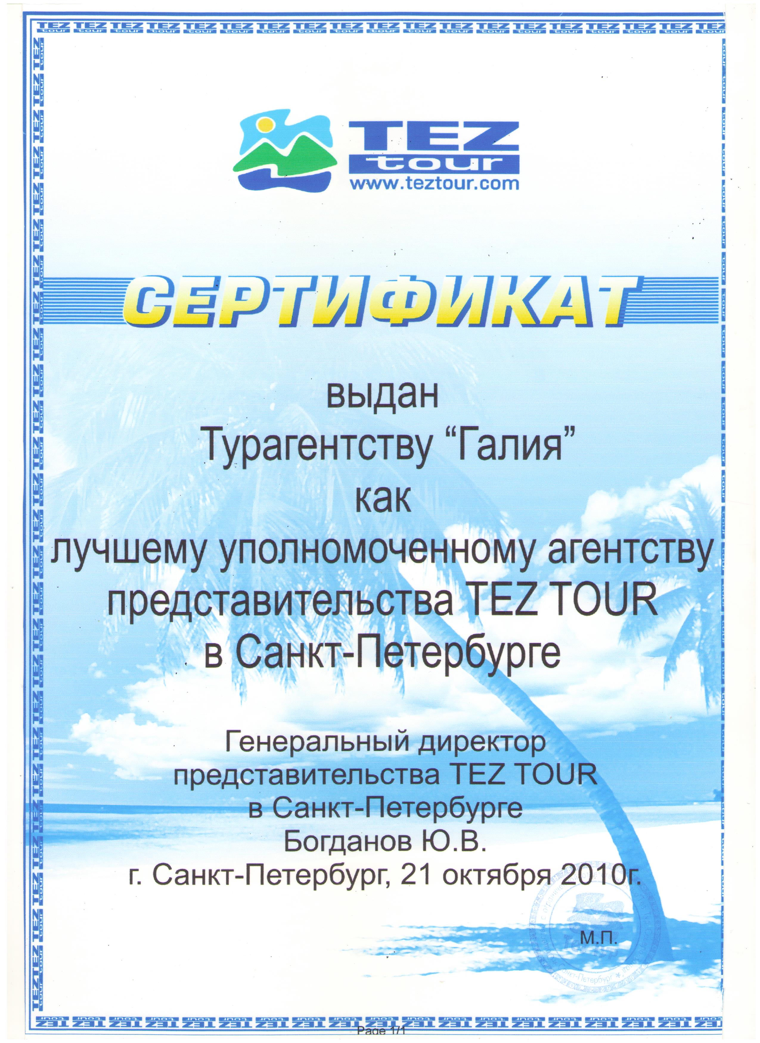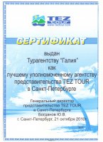 TEZ TOUR - Сертификат - лучшее уполномоченное агентство представительства TEZ TOUR в Санкт-Петербурге (2010 год).