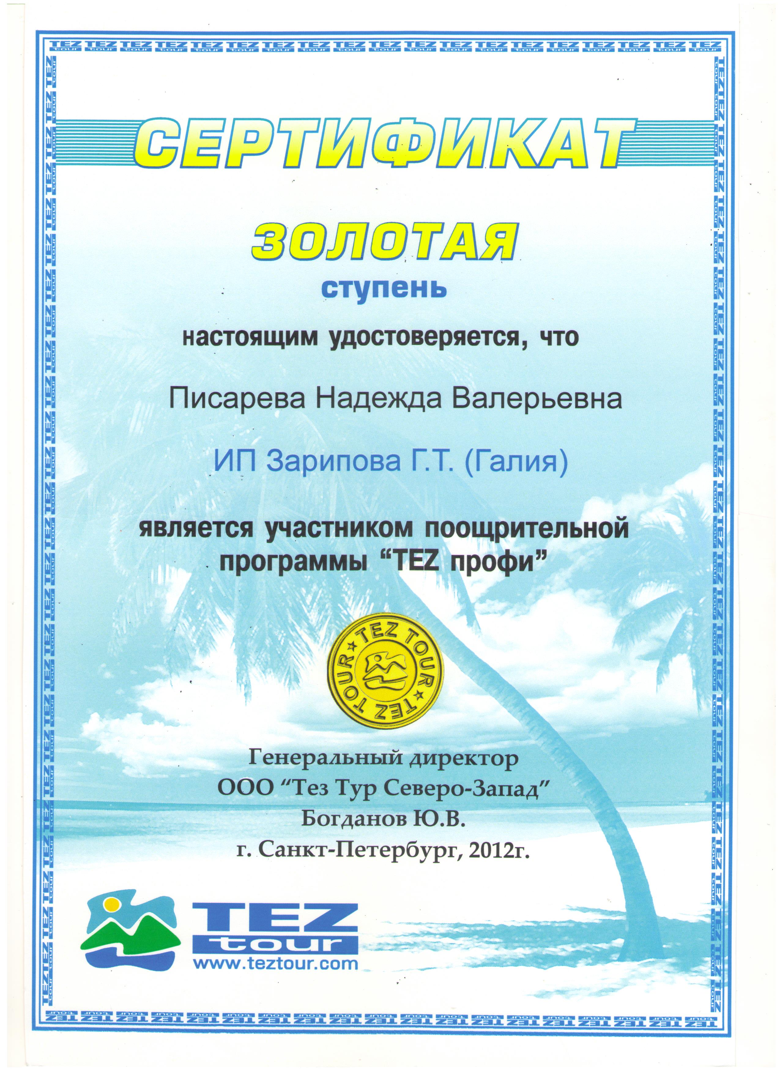 TEZ TOUR - Сертификат Писаревой Надежде Валерьевне - является участником поощрительной программы "TEZ профи" (2012 год).