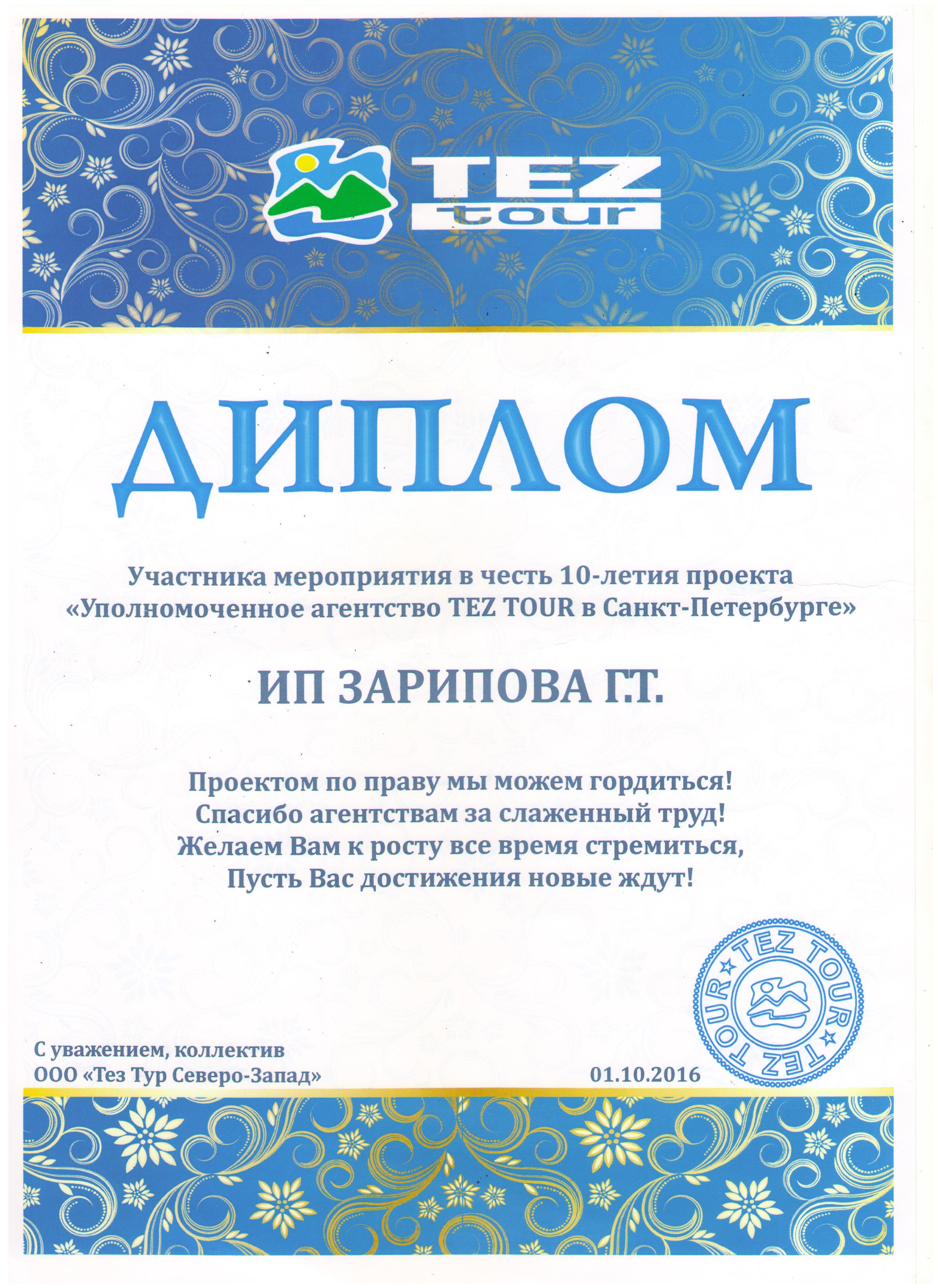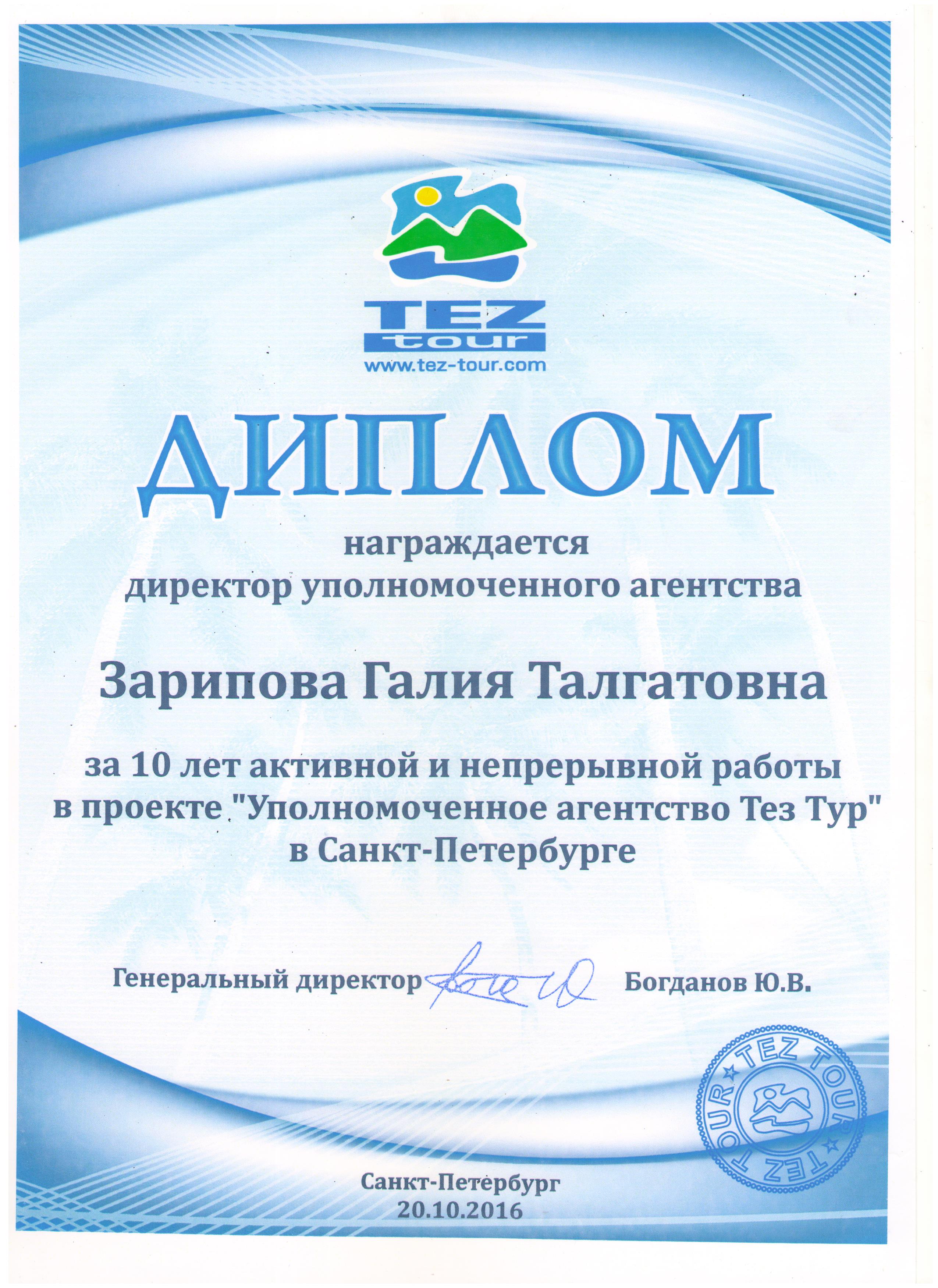 TEZ TOUR - Диплом за 10 лет активной и непрерывной работы в проекте "Уполномоченное агентство Тез Тур" в Санкт-Петербурге (2016 год).