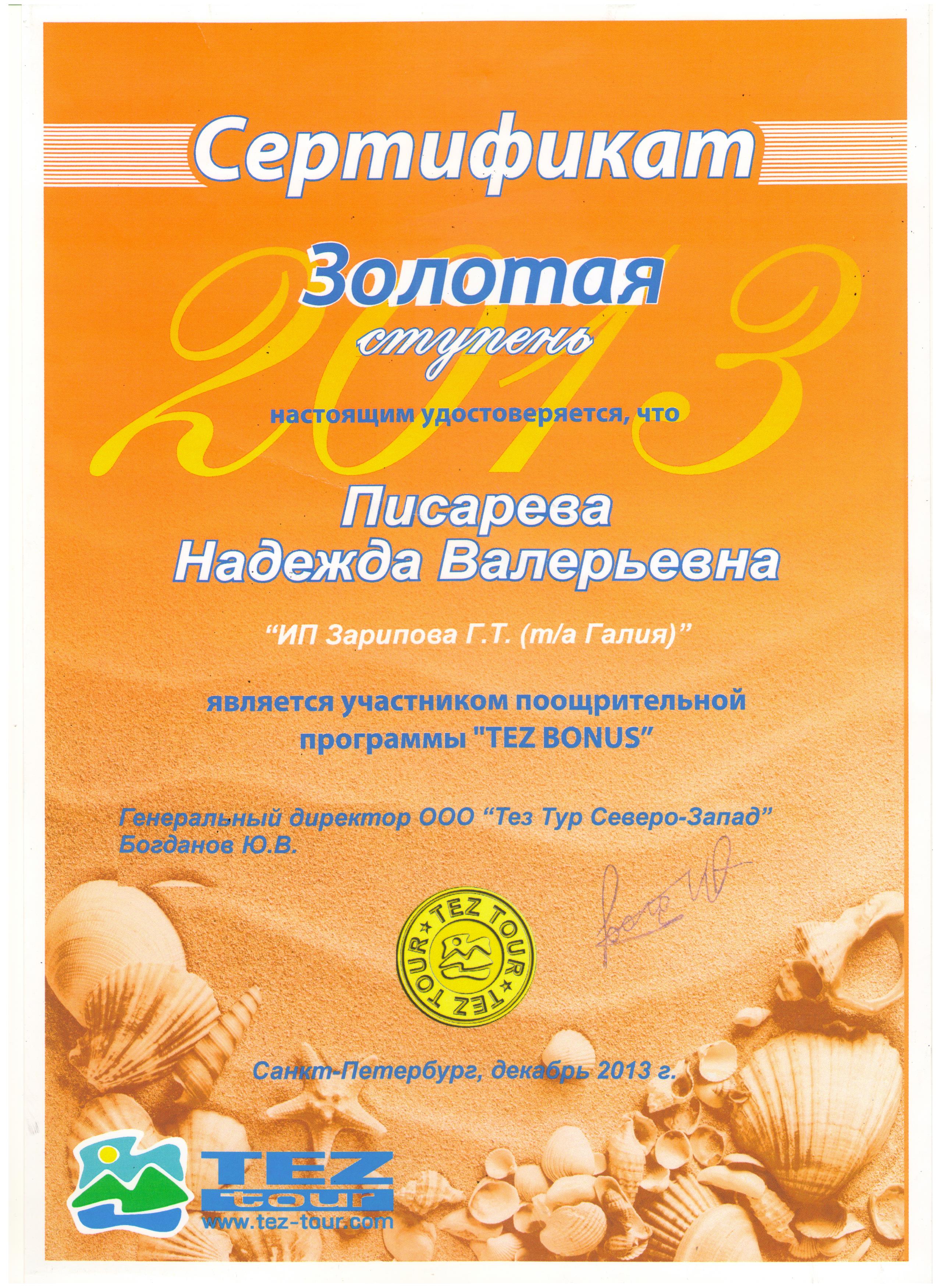 TEZ TOUR - Сертификат Писаревой Надежде Валерьевне - является участником поощрительной программы "TEZ BONUS" (2013 год).