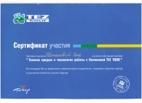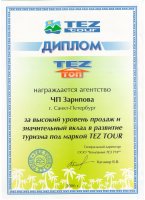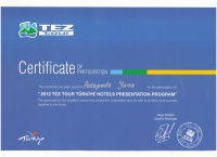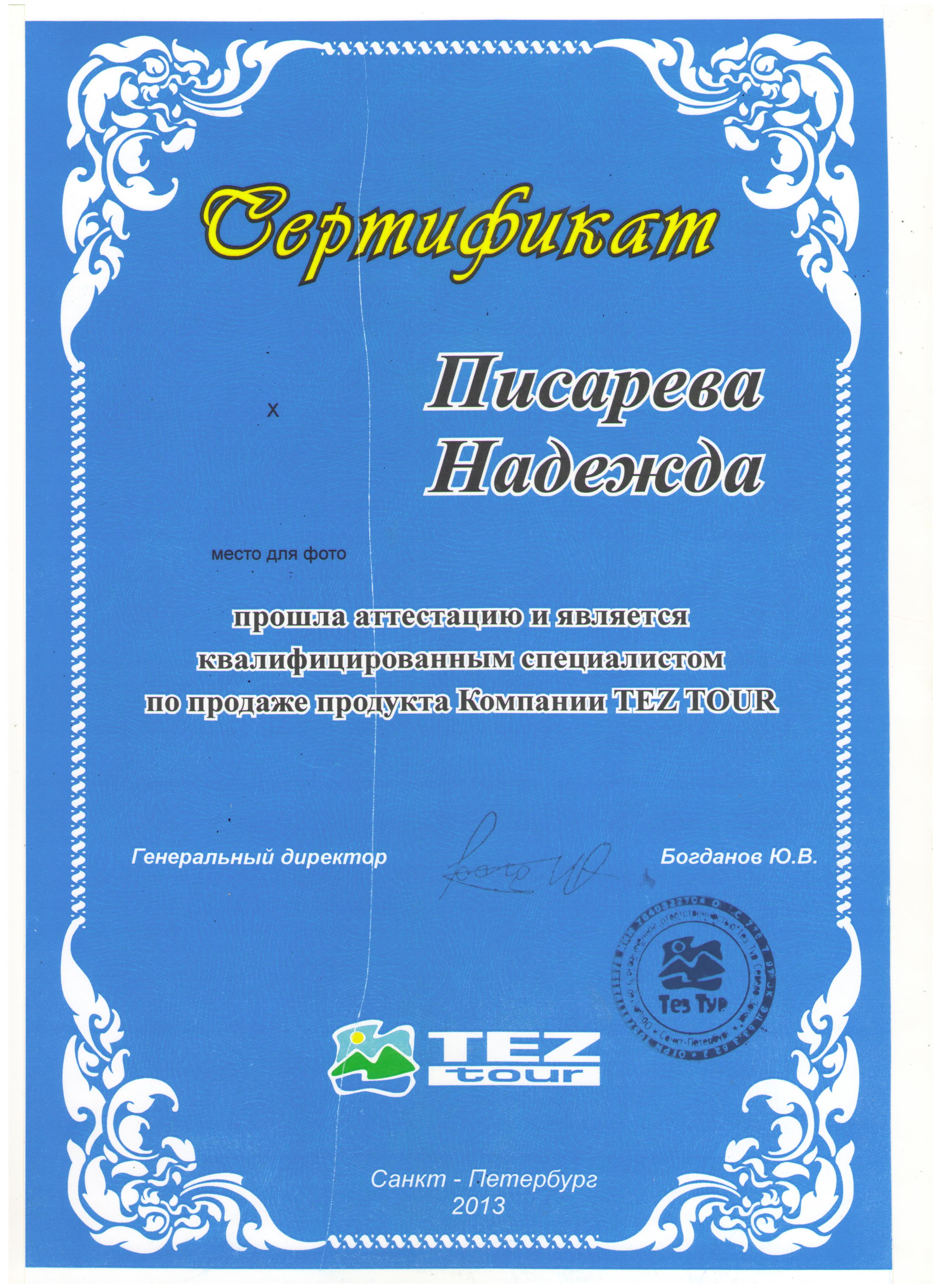 TEZ TOUR - Сертификат Писаревой Надежде - прошла аттестацию и является квалифицированным специалистом по прадажам продукта компании TEZ TOUR (2013 год).