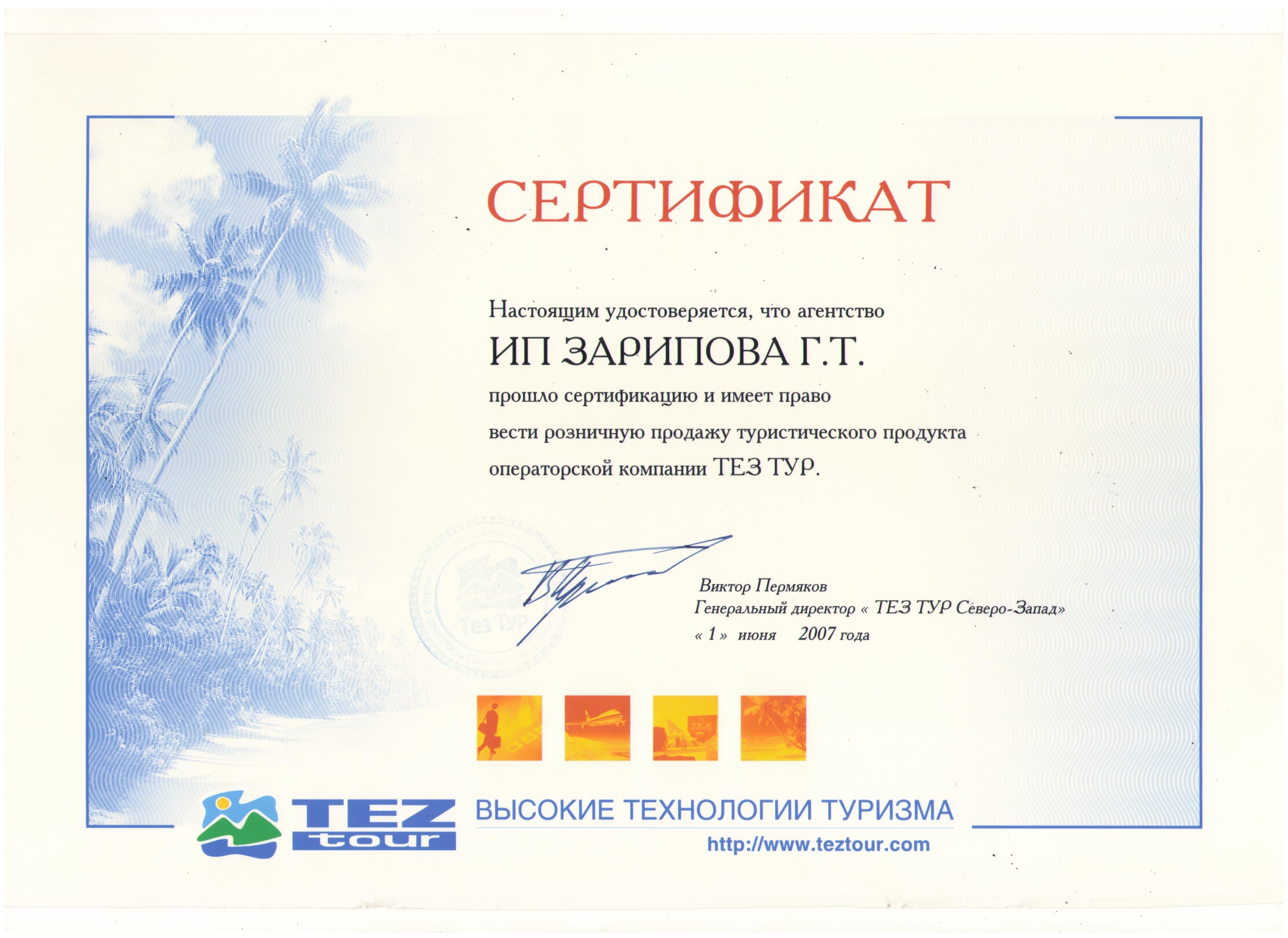 TEZ TOUR - Сертификат - агентство ИП Зарипова Г.Т. прошло сертификацию и имеет право вести розничную продажу туристического продукта операторской комании ТЕЗ ТУР (2007 год).