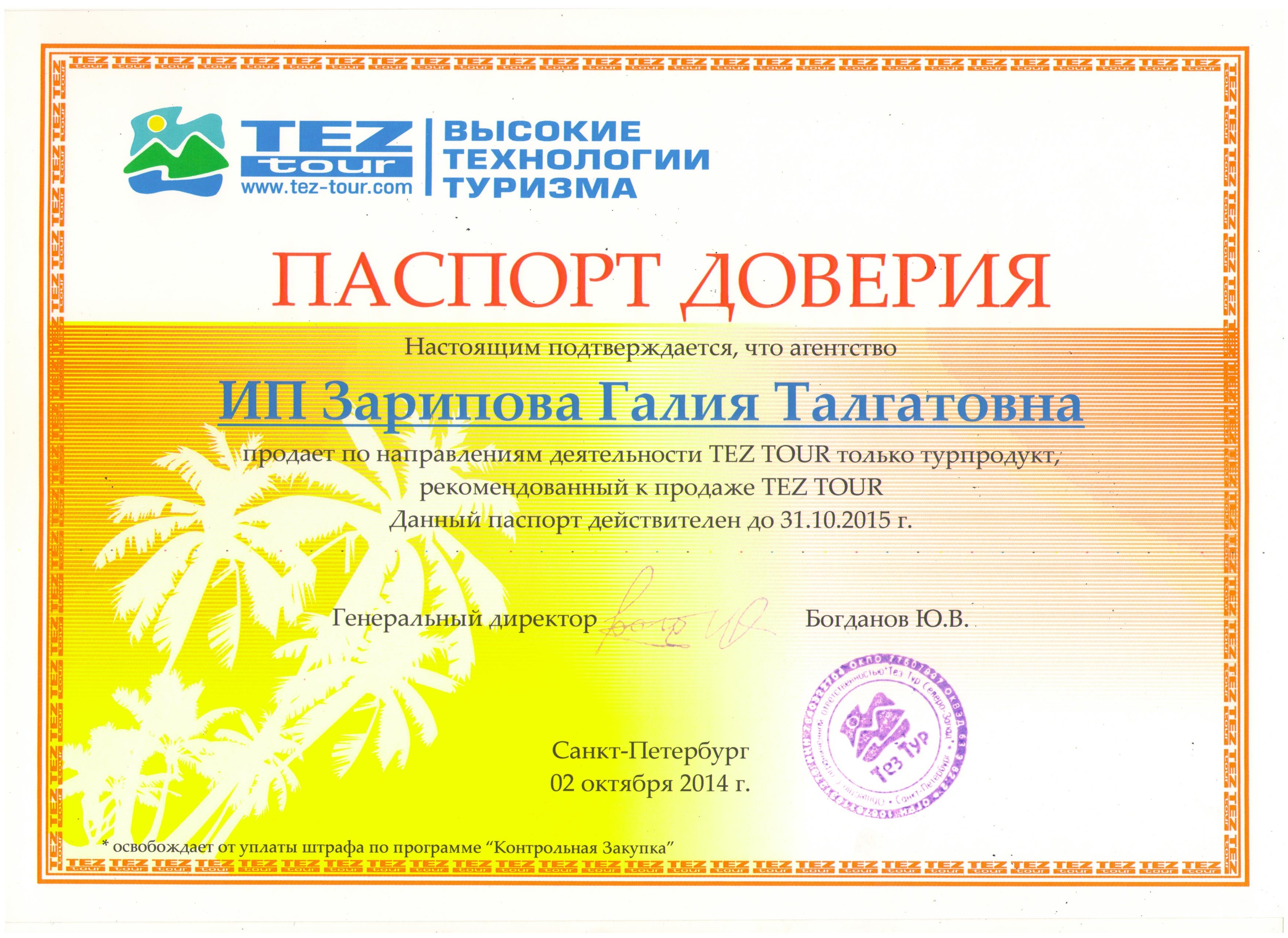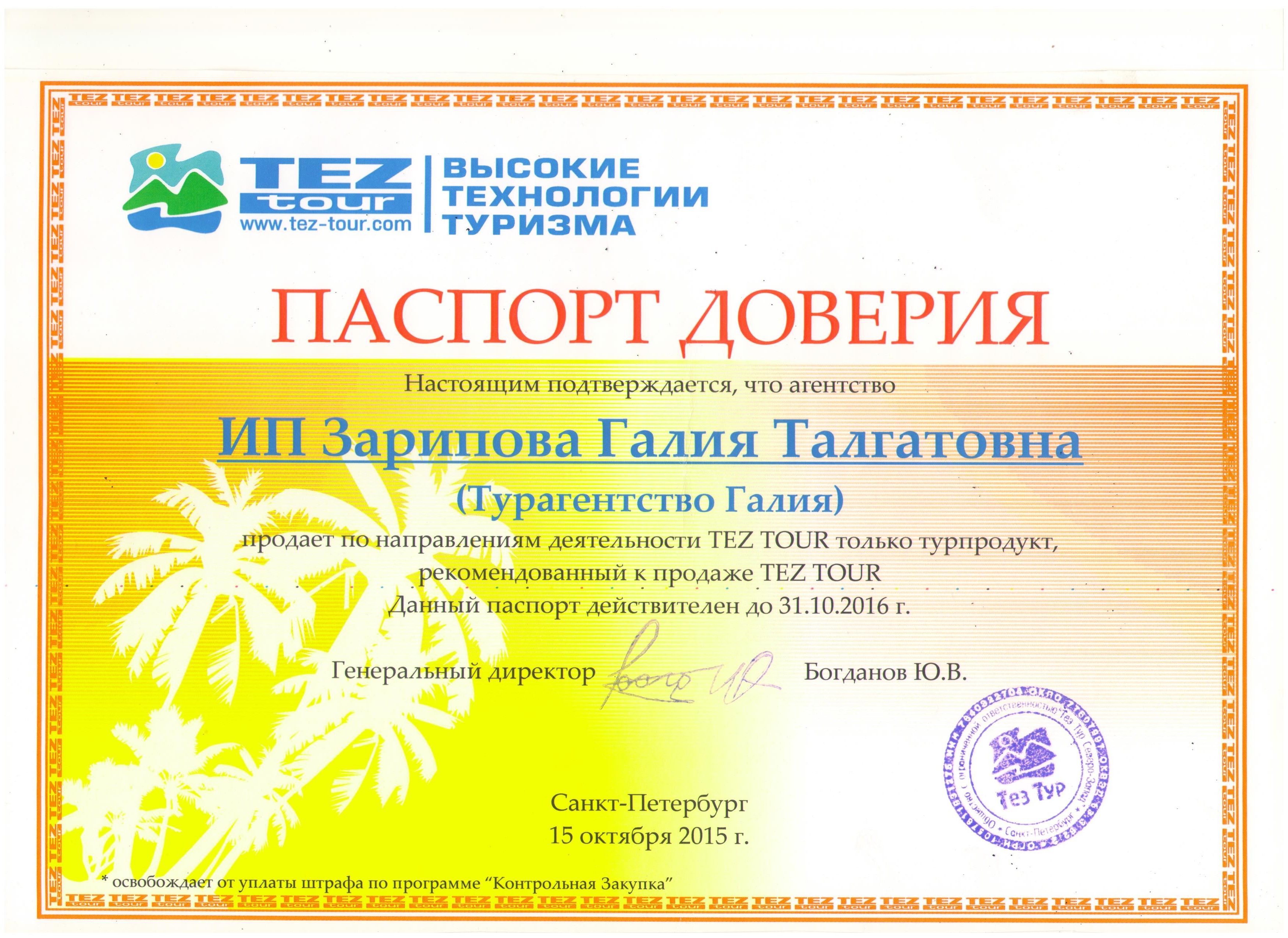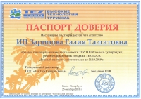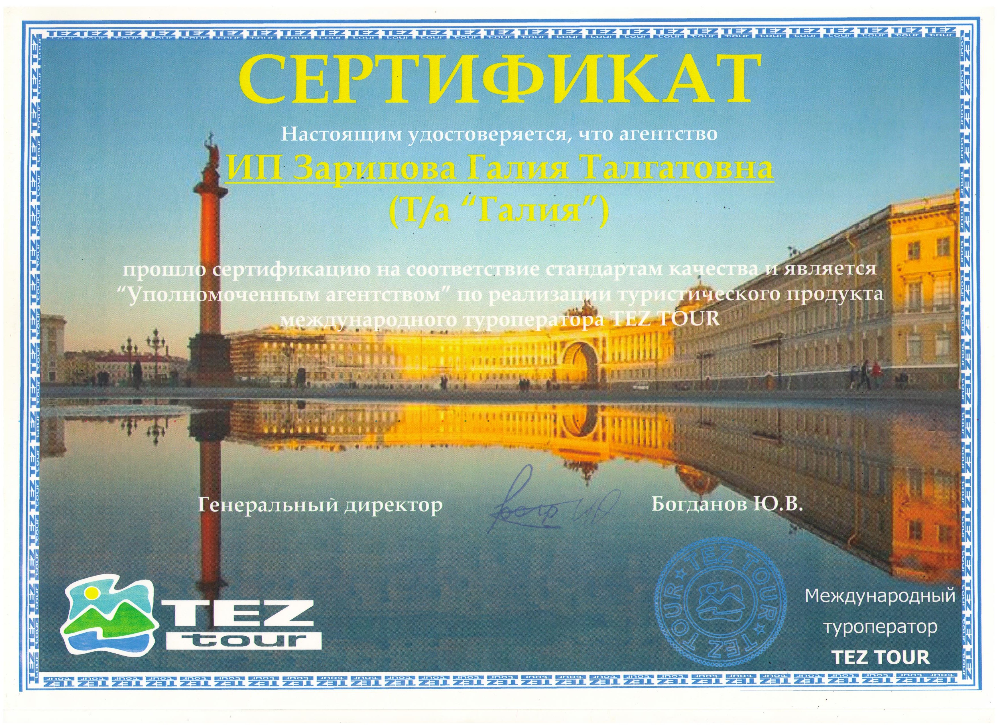 TEZ TOUR - Сертификат - агентство ИП Зарипова Галия Талгатовна (т/а "Галия") прошло сертификацию на соответствие стандартам качества и является "Уполномоченным агентством".