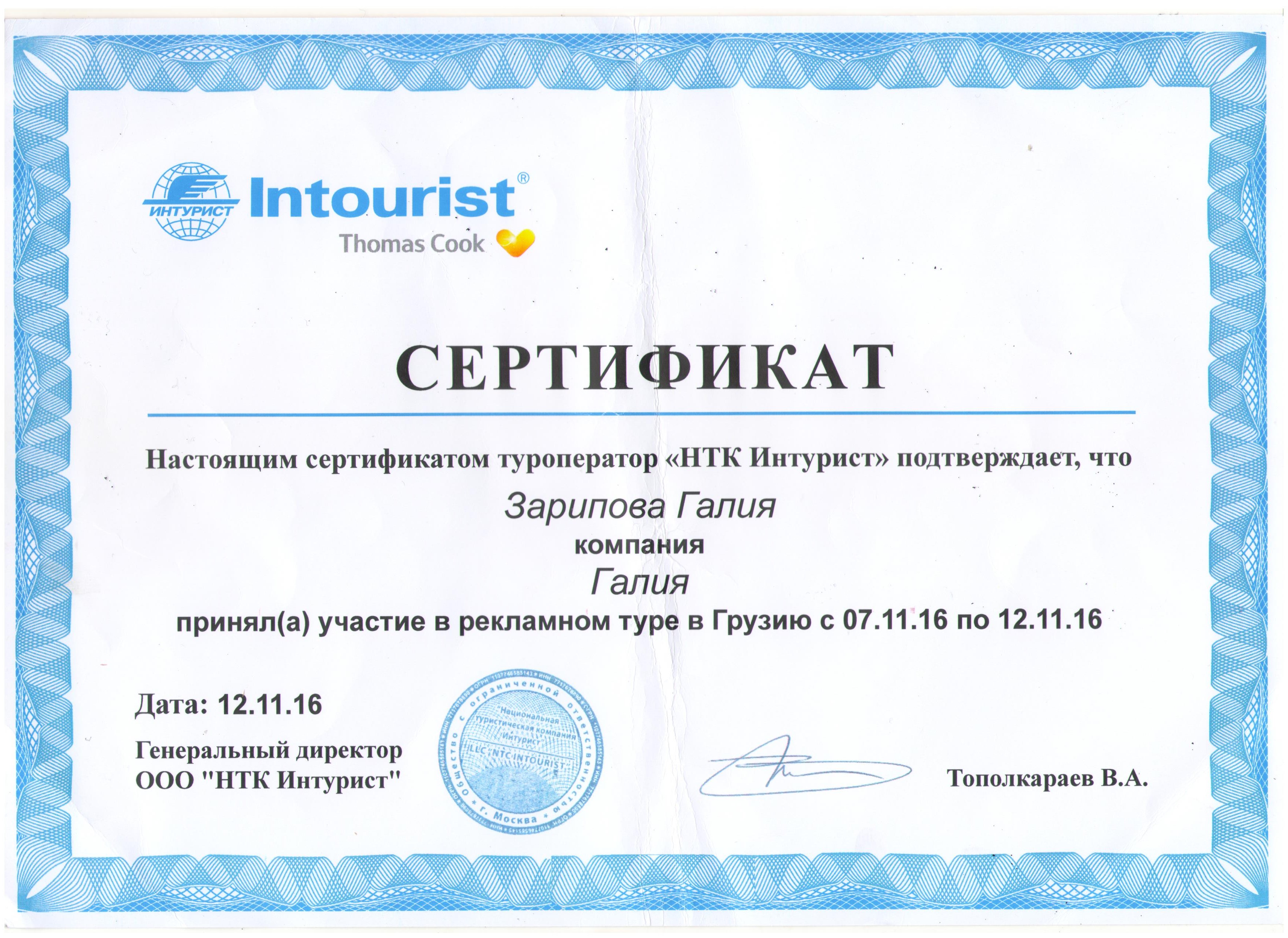 Intourist - Сертификат Зариповой Галие Талгатовне за участие в рекламном туре в Грузию (2016 год).