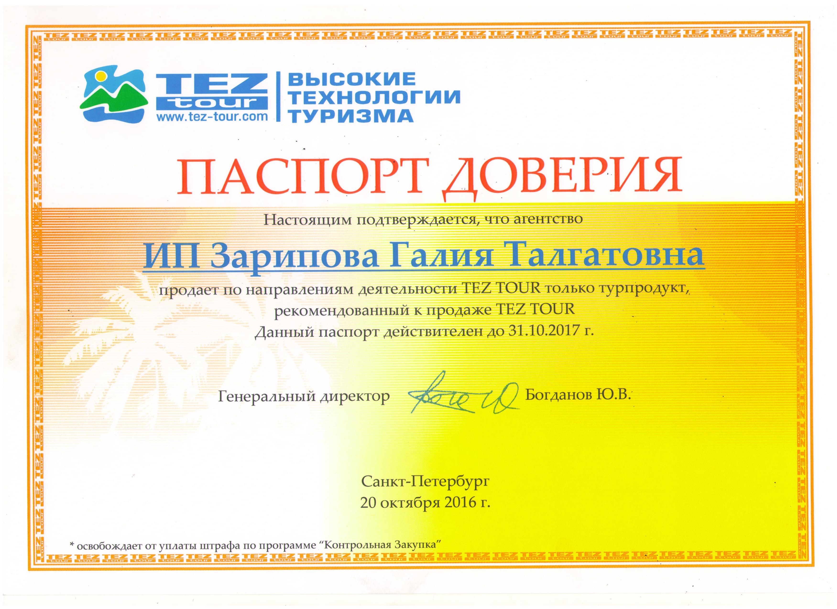 TEZ TOUR - Сертификат, удостоверяющий, что агентство ИП Зарипова Галия Талгатовна прошло сертификацию и является "Уполномоченным агентством" по реализации туристического продукта (2017 год).