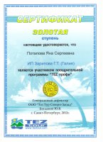 TEZ TOUR - Сертификат Потаповой Яне за участие в обучающем семинаре "Техника продаж и технология работы с команией TEZ TOUR".