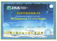 TEZ TOUR - Сертификат, удостоверяющий, что агентство ИП Зарипова Г.Т. (т/а Галия) прошло сертификацию и является "Уполномоченным агентством" (2013 год).