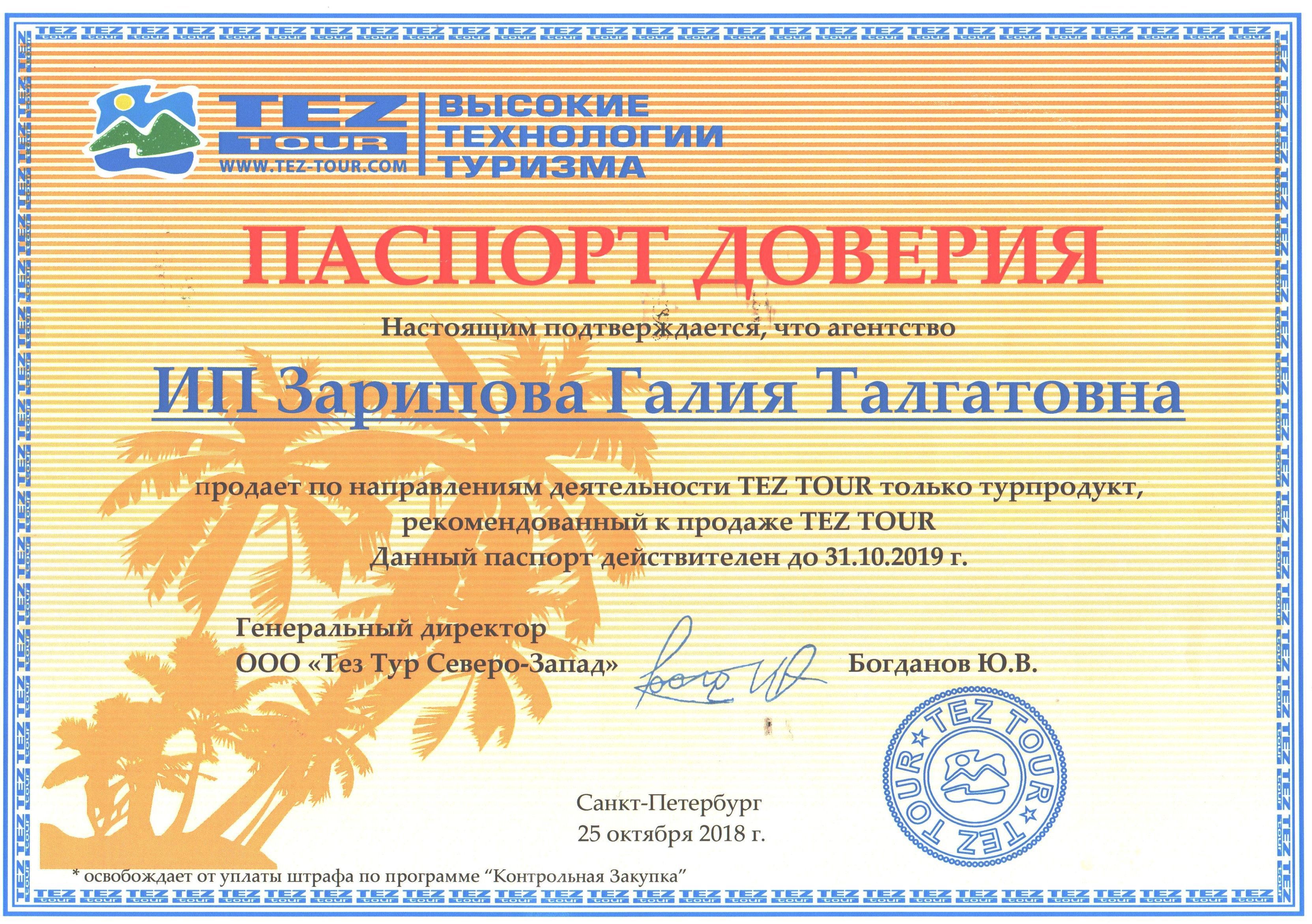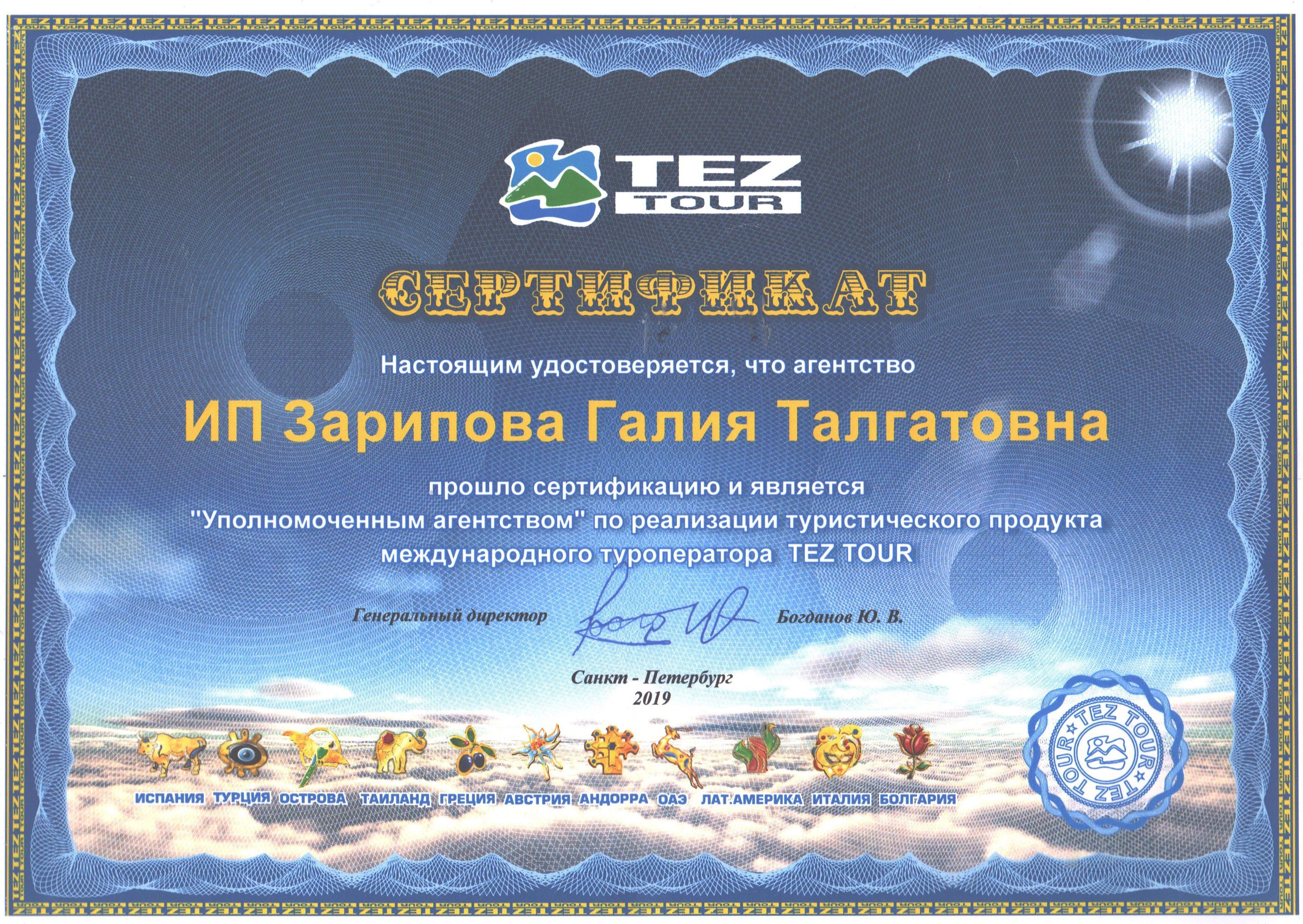 TEZ TOUR - Сертификат, удостоверяющий, что агентство ИП Зарипова Галия Талгатовна прошло сертификацию и является "Уполномоченным агентством" по реализации туристического продукта (2019 год).
