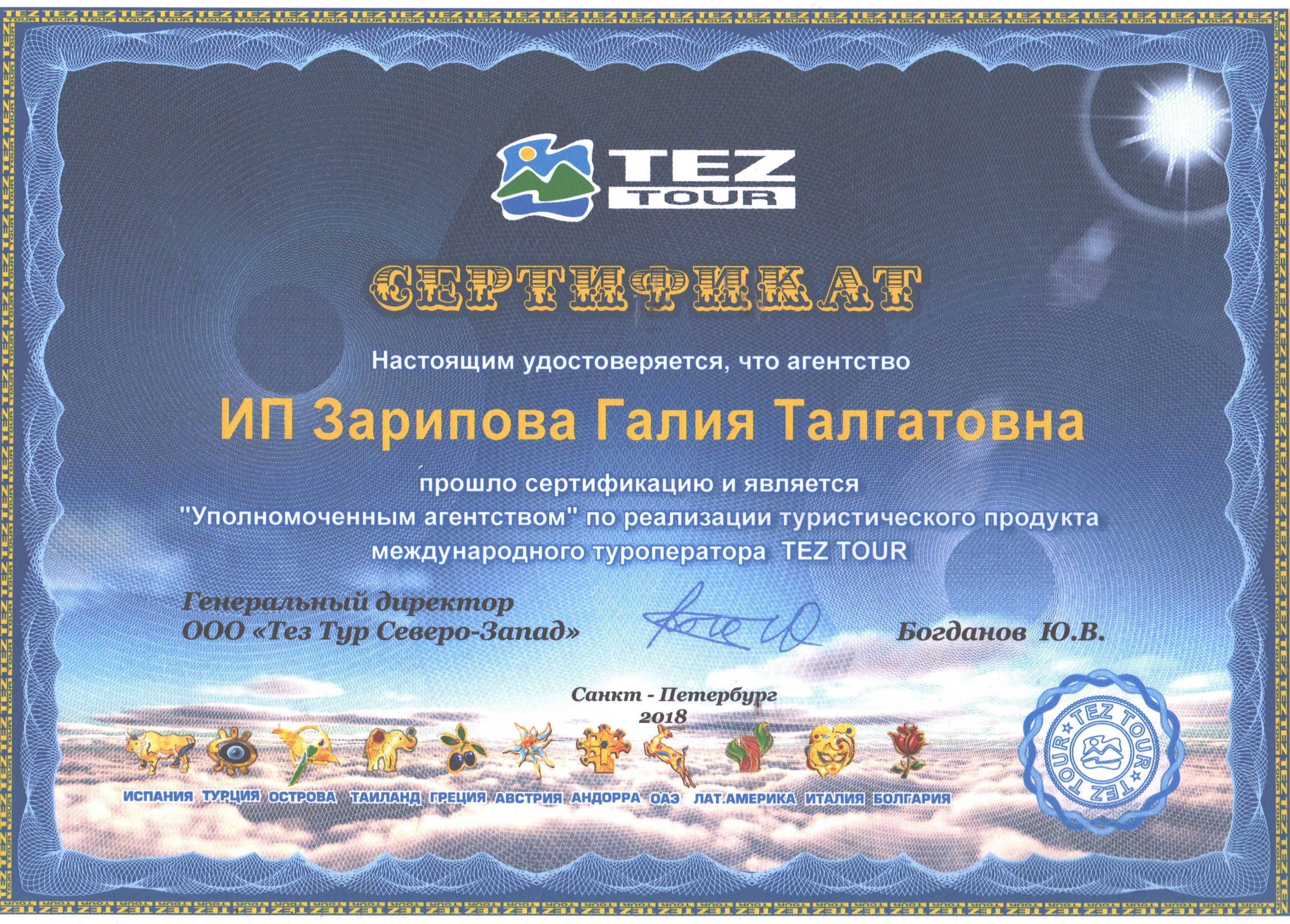 TEZ TOUR - Сертификат, удостоверяющий, что агентство ИП Зарипова Галия Талгатовна прошло сертификацию и является "Уполномоченным агентством" по реализации туристического продукта (2018 год).