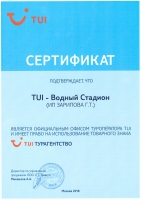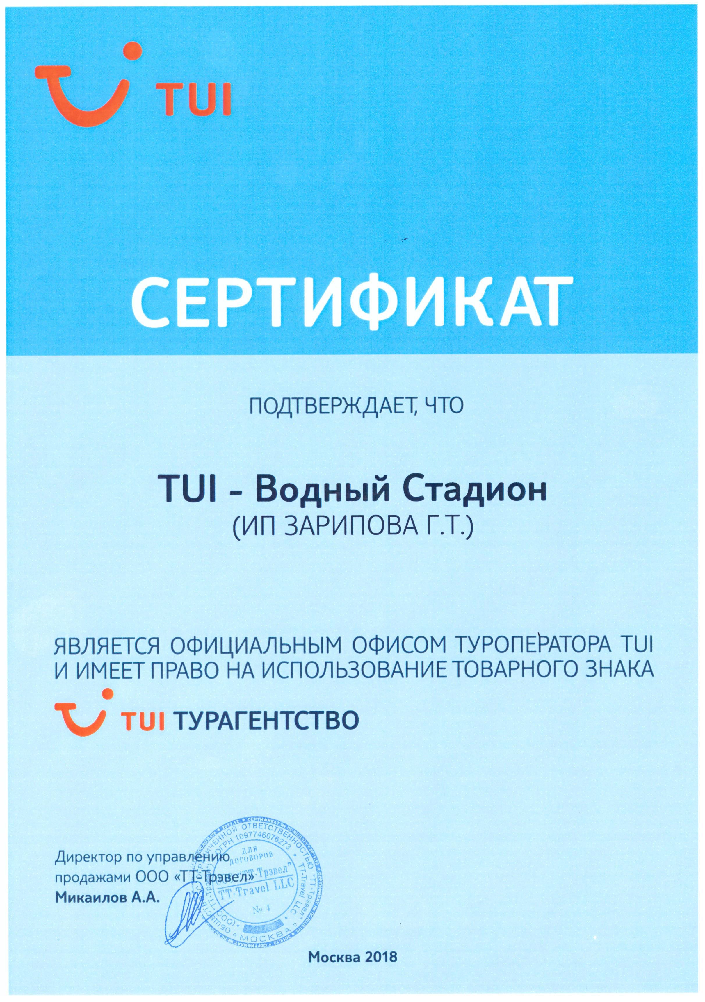 TUI - Сертификат, подтверждающий, что агентство TUI - Водный стадион (ИП Зарипова Г.Т.) является официальным офисом туроператора TUI (2018 год).