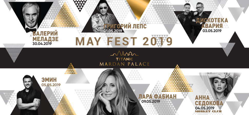 Представляем Вашему вниманию Май Фест 2019 в отеле Titanic Mardan Palace 5*, который пройдет с 30 апреля, начиная выступлением Валерия Меладзе, и закончится 9 мая концертом Лары Фабиан.