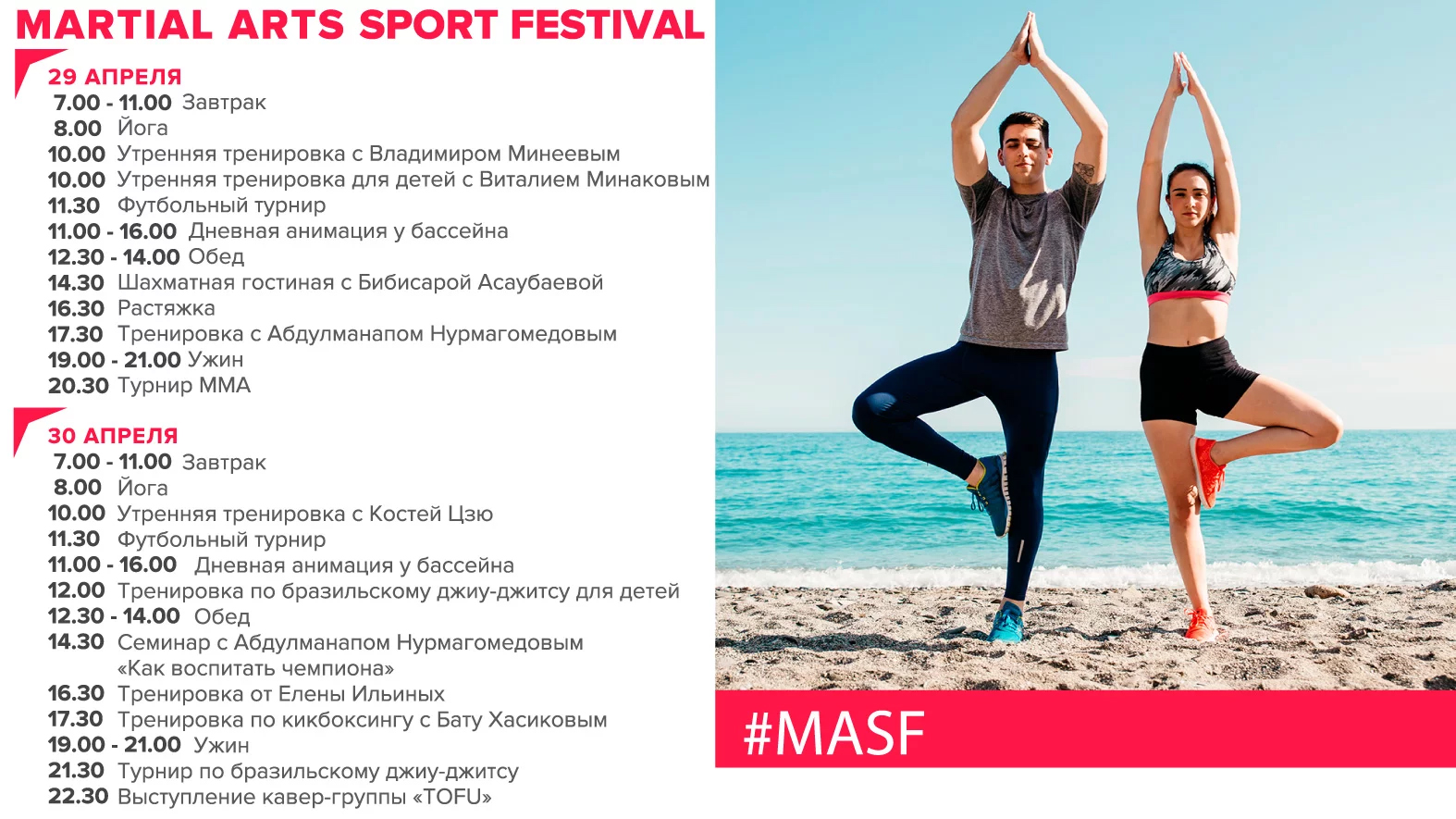 Каждый день будут проходить увлекательные тренировки для взрослых и детей, а так же различные мастер-классы, семинары и рекомендации по питанию, игры в футбол, волейбол, теннис, йога, пилатес, плавание и др.