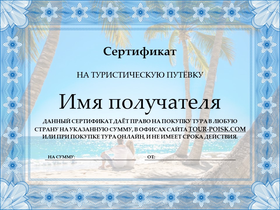 Данный сертификат даёт право на покупку тура в любую страну на указанную сумму, в офисах сайта tour-poisk.com или при покупке тура онлайн.