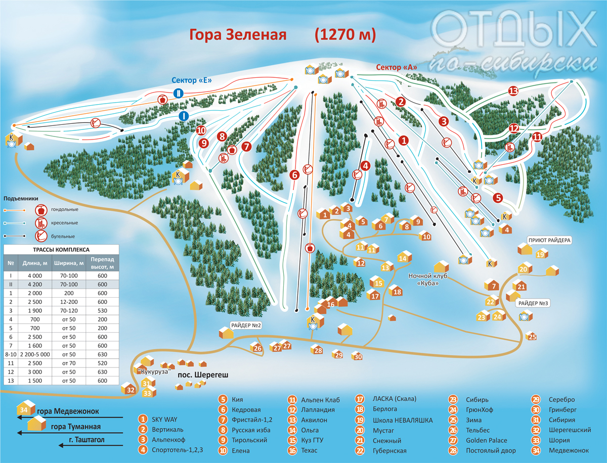 На горе Зеленая - 2 основные зоны: сектор А (8 трасс, 2 из которых сертифицированы FIS) и сектор Е (2 трассы).