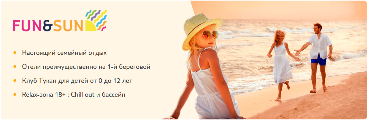 FUN&SUN - это концепция отдыха, где каждый будет занят своими делами. Больше всего отели FUN&SUN рассчитаны на семейный отдых, где продуманна любая мелочь для каждого, будь это ребенок или взрослый. Если кратко - то это эта та концепция, о которой мечтают все родители! Пока родители отдыхают на пляже или где-то еще, за детьми присмотрят воспитатели клуба Тукан, где детям не будет скучно и их займут там по полной программе! Наслаждайтесь отдыхом, а дети будут увлечены своими интересными делами и даже на время позабудут о своих родителях.
