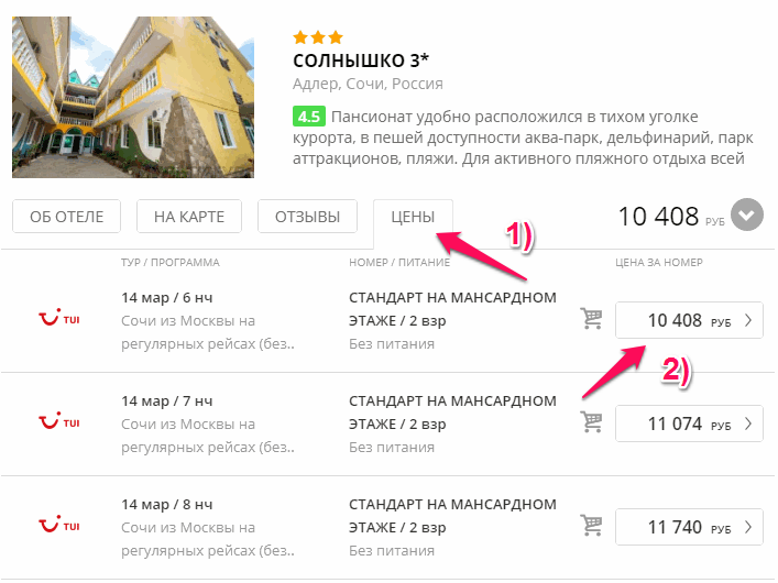 8. Для просмотра более подробной информации и покупки тура сначала нажмите на вкладку цены, а потом выберите подходящий вариант:
