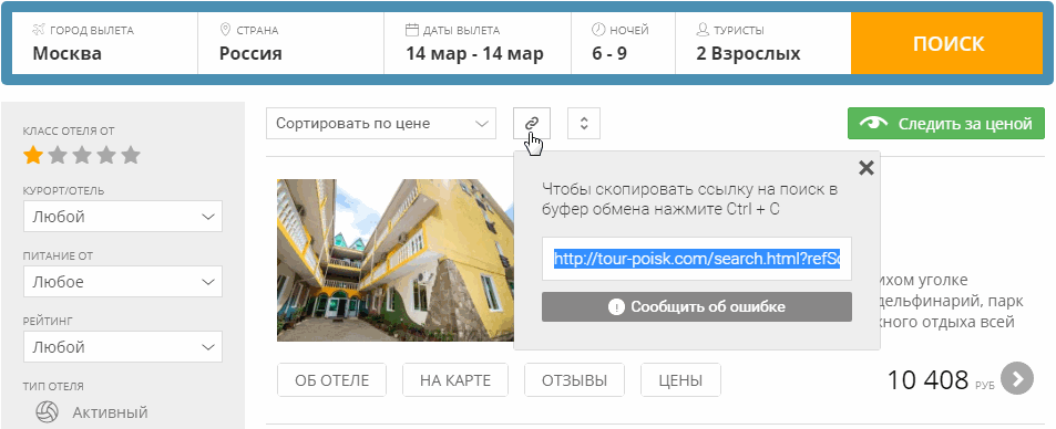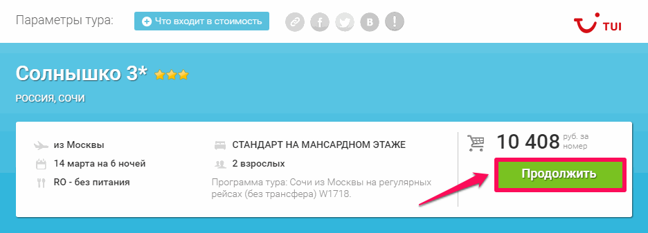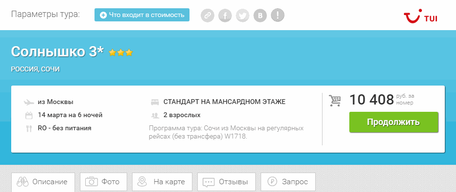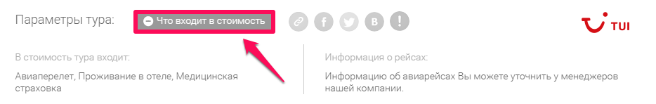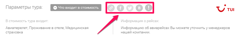 Обратите внимание, что правее от кнопки "Что входит в стоимость" Вы увидите возможность скопировать прямую ссылку на тур или поделиться ей в социальных сетях, таких как Facebook, Twitter, ВКонтакте.