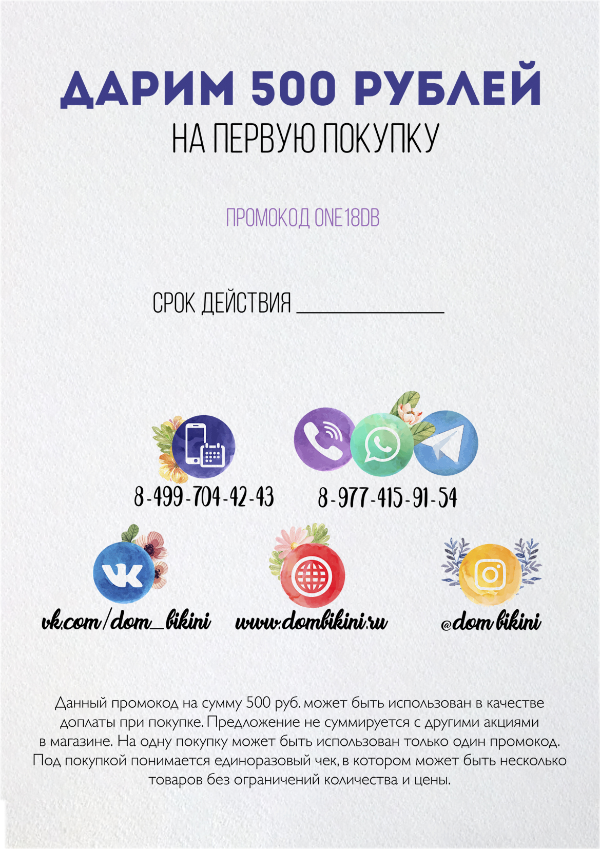 Флаер Вам даёт скидку 500 рублей при покупке любого купальника на сайте dombikini.ru